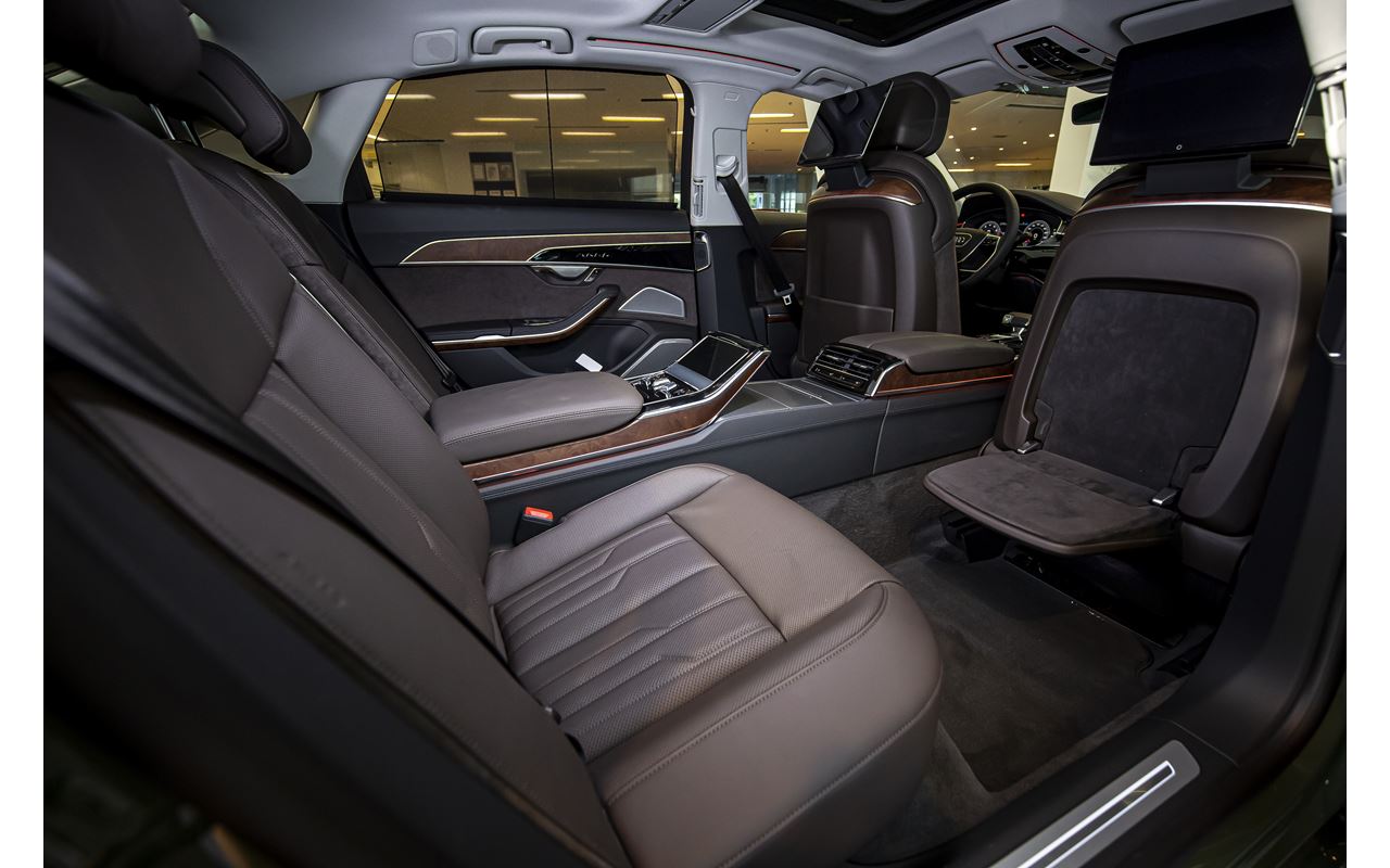 Audi A8L mang đến vị trí ngồi đặc biệt thoải mái cho cả hàng ghế trước và sau. Tất cả các ghế của Audi A8L đều được bọc da Valcona cao cấp, nhiều chi tiết ốp gỗ tinh tế. Ốp trang trí bệ cửa bằng nhôm.