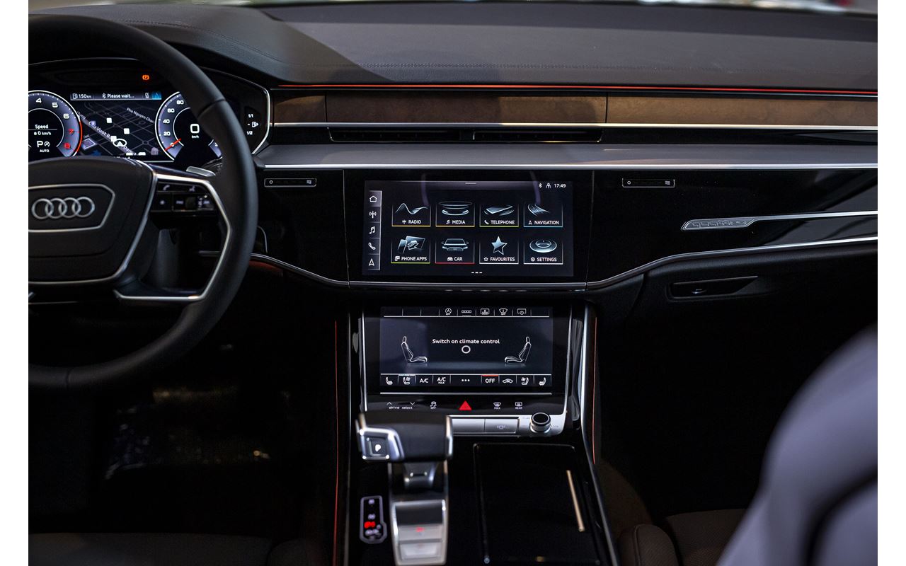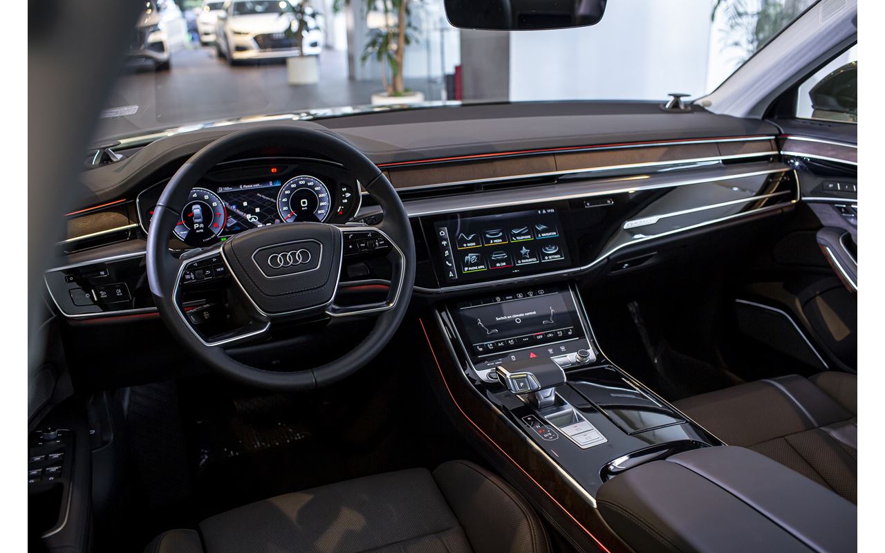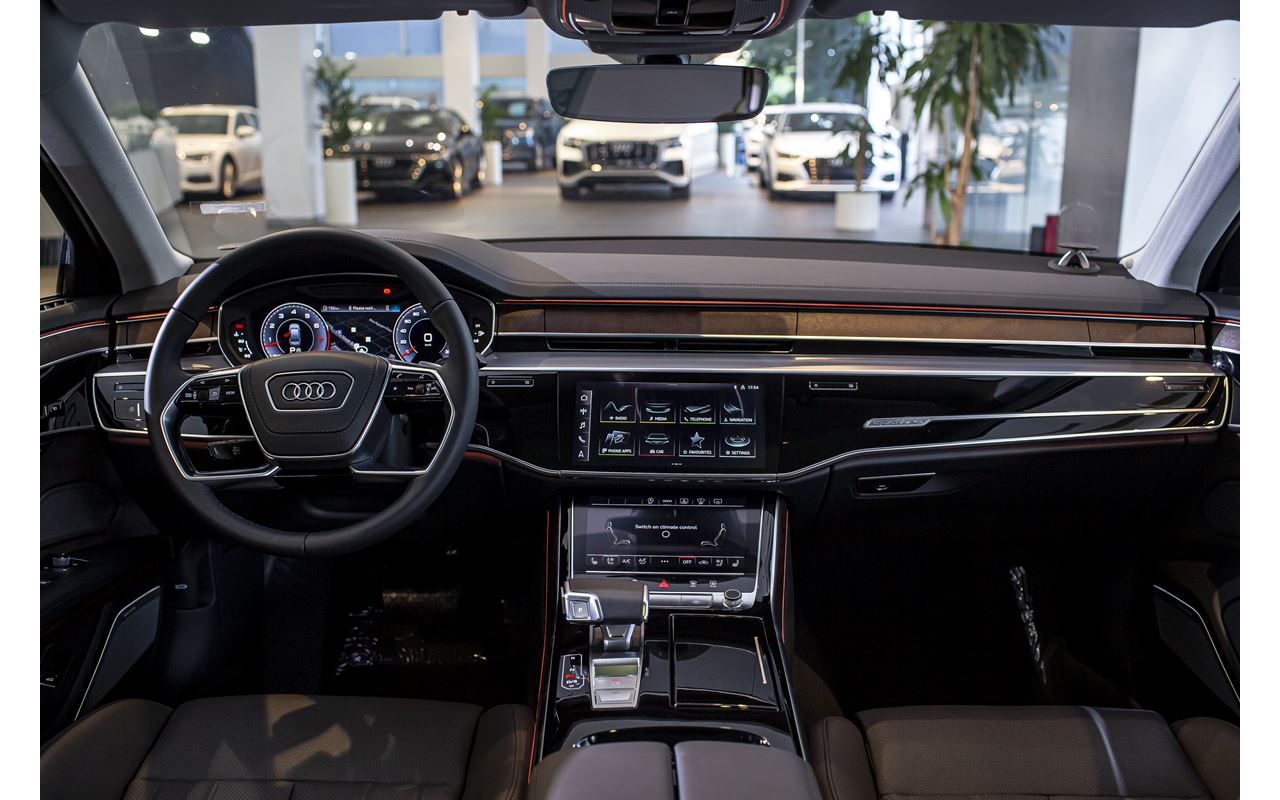Vô lăng của Audi A8L được bọc da 2 chấu kép, mạ chrome kết hợp với các phím chức năng và lẫy chuyển số. Phía sau vô lăng là màn hình tốc độ điện tử Audi virtual cockpit và màn hình hiển thị thông tin trên kính lái HUD. Hệ thống thông tin giải trí và điều hướng MMI Navigation Plus cũng được bố trí trong tầm tay của người lái với hai màn hình cảm ứng lớn bao gồm màn hình trên và dưới với kích thước lần lượt là 10.1 inch và 8.6 inch.