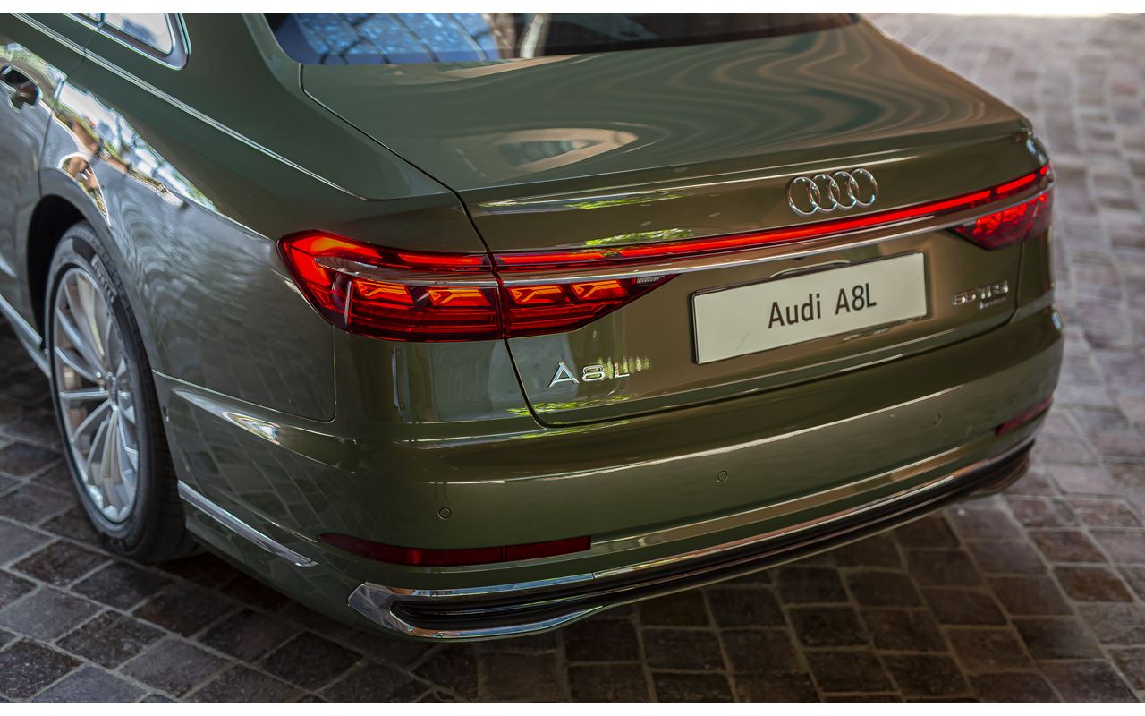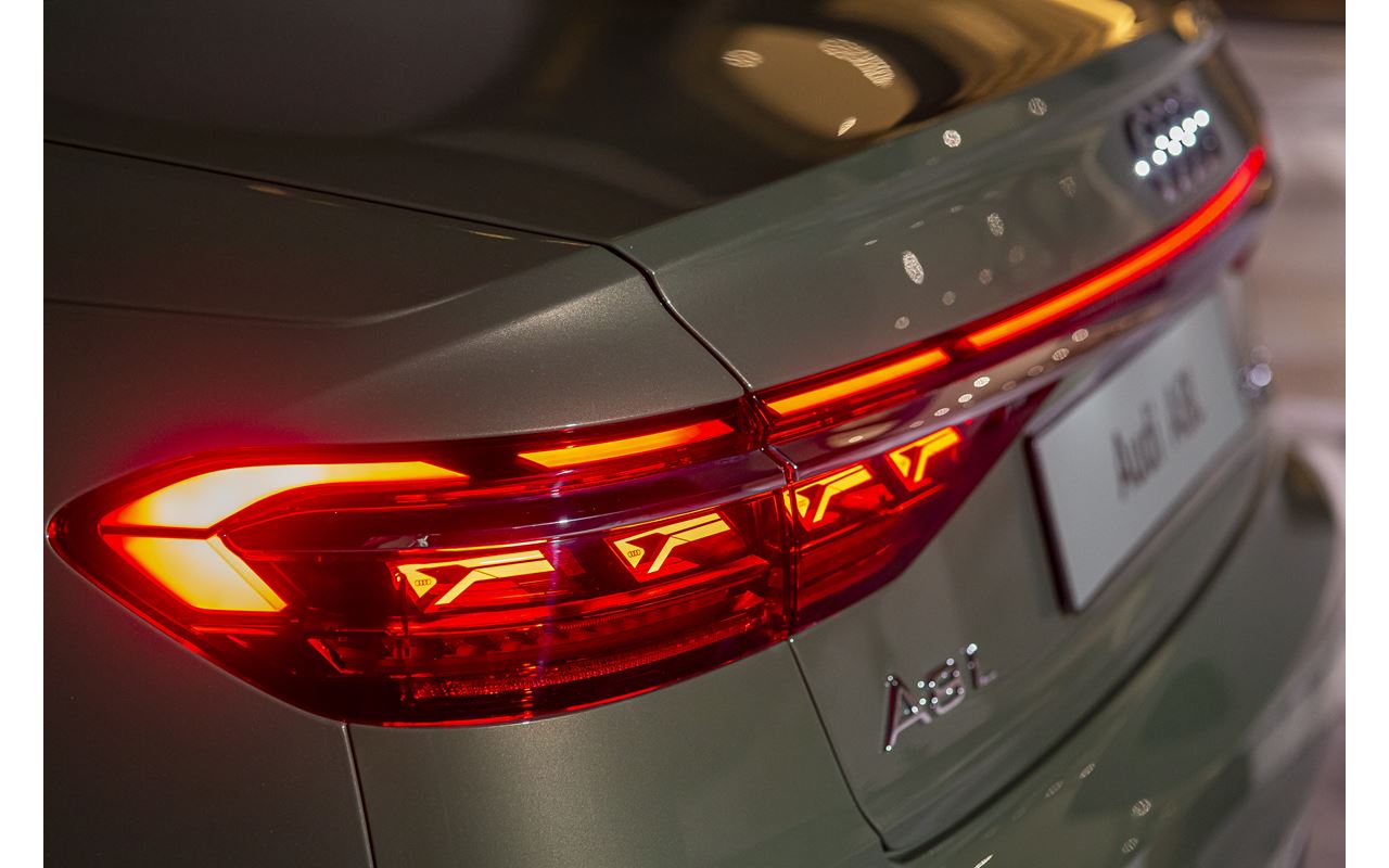 Với Audi A8L , điểm nổi bật nhất ở phần đuôi xe đó chính là thiết kế kéo dài hai bên của cụm đèn hậu. Cặp đèn OLED phía sau mang đến trải nghiệm công nghệ ấn tượng với nhiều đồ họa ánh sáng khác nhau khi tắt cũng như khởi động xe. Nối liền giữa 2 đèn hậu là dải chrome mỏng chạy dài tôn lên nét sang trọng.
