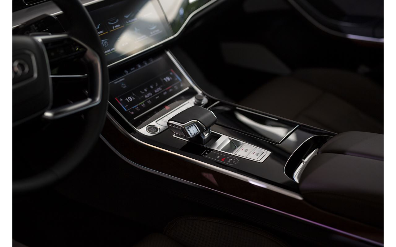 Cụm cần số của Audi A8L được bọc da cao cấp. Bên cạnh đó, xe có thêm các hệ thống hỗ trợ lái như: gương chiếu hậu chống chói tự động, chìa khoá thông minh & cảm biến điều khiển mở khoang hành lý…